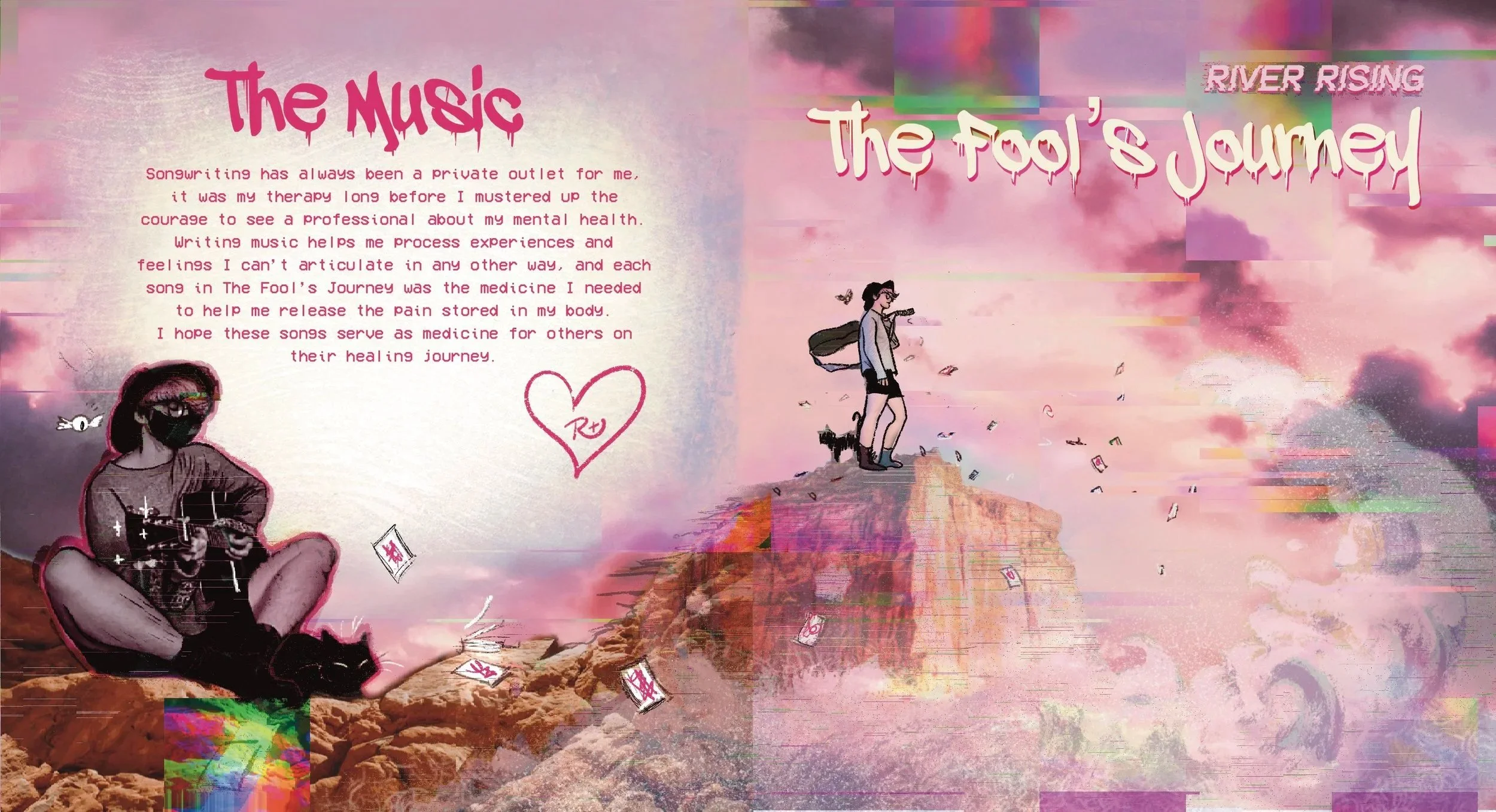I designed a CD booklet centered around my own songs about processing trauma using music therapy. I chose tarot as the inspiration for my title and theme due to the relevant nature of the individuals path towards self mastery and healing along their life’s journey.